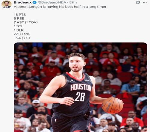 此役阿爾佩倫-申京表現(xiàn)非常出色,首節(jié)9分鐘里他就已經(jīng)3中3拿到6分4籃板4助攻,次節(jié)9分鐘里更是6中3+三分1中1拿到12分5籃板3助攻,半場18分9籃板7助攻1搶斷1蓋帽1失誤,真實(shí)命中率77.3%,正負(fù)值+24。國王的內(nèi)線群根本無法限制他分毫。