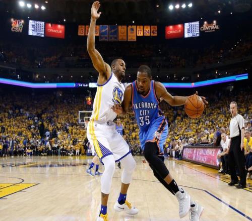 首先,我們先來談?wù)劧磐俚谋憩F(xiàn),雷霆隊能夠在前四場取得絕對的領(lǐng)先優(yōu)勢,靠的就是二人的頂級發(fā)揮。在這4場比賽中,杜蘭特場均可以貢獻31.8分、7.5個籃板和3.3次助攻,投籃和三分命中率分別達到了50%和42.1%,在進攻端完全就是Bug級別的存在,史蒂夫·科爾無論如何進行排兵布陣,都無法阻擋杜蘭特的投射,造成了勇士隊的防線大崩盤。