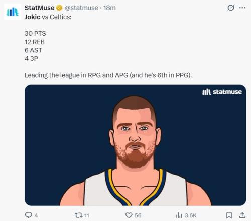 這場比賽約基奇33分鐘,28中11,三分13中4,罰球7中4,拿到30分12籃板6助攻,命中率39.3%,三分命中率30.8%,真實(shí)命中率48.3%,正負(fù)值+13,他在末節(jié)只打了3分鐘就早早打卡下班了。