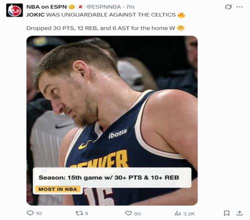 此役后約基奇場均12.5籃板聯(lián)盟第一,場均10.4助攻聯(lián)盟第一,場均28.8分聯(lián)盟第六,還有場均1.4搶斷0.77蓋帽,命中率57.7%,三分命中率41.3%,賽季21次三雙聯(lián)盟第一。