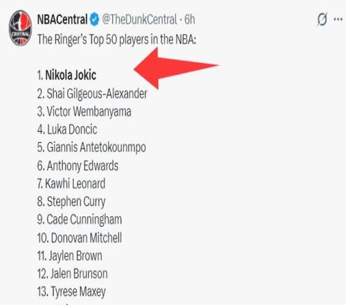 在這場比賽之前,美媒The Ringer選出了本賽季前50球星,約基奇第一、亞歷山大第二、文班亞馬第三、東契奇第四、揚(yáng)尼斯第五、華子第六、倫納德第七、庫里第八、坎寧安第九、米切爾第十。