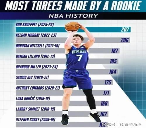 穆雷在其輝煌賽季中,憑借極高的出勤率,在80場比賽中投進206記三分,榮膺新秀三分王。然而,與穆雷相比,克努佩爾僅用59場比賽便登頂新秀歷史之巔,少打了整整21場,這一成就令人瞠目結(jié)舌。