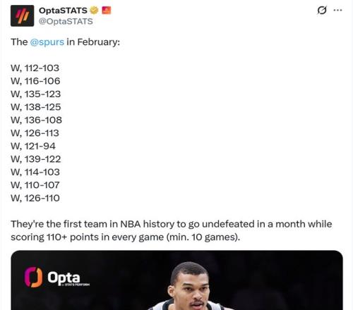 如果算上具體得分,那么這支年輕的馬刺隊(duì)更是打破塵封79年之久的紀(jì)錄,成為NBA歷史至今首支在單月份每場(chǎng)比賽總得分都達(dá)到110+分,而且還保持全勝的球隊(duì)。