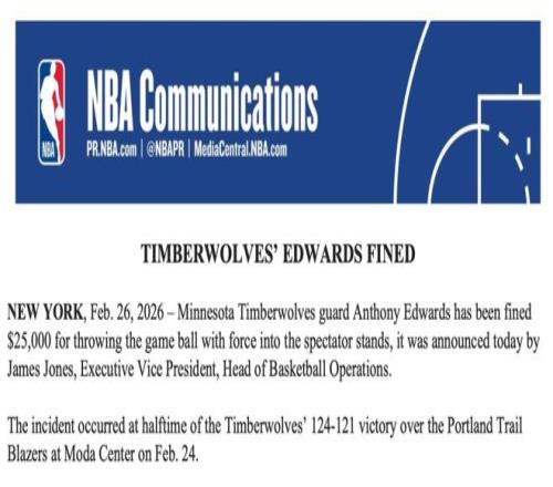 北京時(shí)間2月27日,NBA籃球運(yùn)營(yíng)執(zhí)行副總裁詹姆斯-瓊斯今日宣布,森林狼后衛(wèi)愛德華茲和魔術(shù)后衛(wèi)貝恩都因用力將比賽用球扔向觀眾席,各被罰款25000美元。