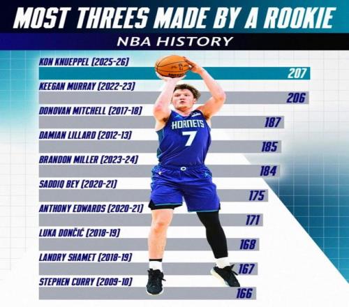 單場命中8記三分追平其個人生涯紀(jì)錄,憑借這樣的表現(xiàn),克努佩爾本賽季已經(jīng)命中209記三分,不僅高居本賽季全聯(lián)盟第一,也讓其超越基根-穆雷的206記三分,創(chuàng)造新的NBA歷史新秀單賽季三分命中數(shù)紀(jì)錄。
