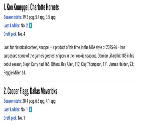 也正是憑借這樣的表現(xiàn),克努佩爾在NBA官網(wǎng)公布的最新一期新秀榜單中,成功超越“美國之子”弗拉格升至第一。