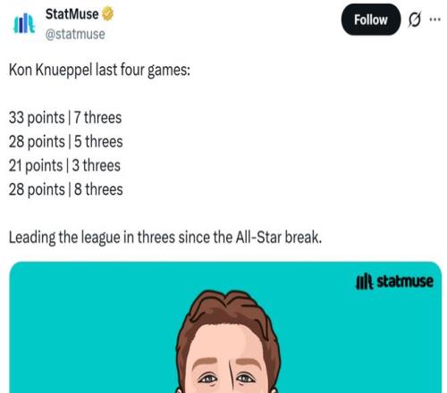 更讓人眼前一亮的是,克努佩爾幾乎沒有遭遇新秀墻,反而開季至今狀態(tài)一路呈現(xiàn)出上揚勢頭,全明星后的5場比賽克努佩爾合計命中多達(dá)26記三分高居同期聯(lián)盟第一。