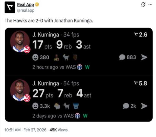 本場庫明加老鷹生涯首次首發(fā),全場出戰(zhàn)30分鐘,9中5,輕松拿下17分9板3助,正負值+23,加上首秀替補出戰(zhàn)24分鐘,高效轟下27分7板4助,庫明加為老鷹隊出戰(zhàn)兩場比賽合計轟下44+16+7,場均拿下22分8板3.5助,老鷹隊2勝0負。