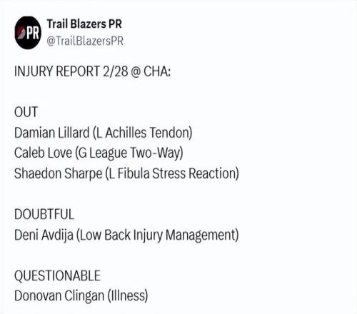 開拓者最新的傷病名單顯示,明日對(duì)陣黃蜂,利拉德、樂福、夏普是缺陣狀態(tài),阿夫迪亞因背部傷病管理大概率也不打,生病的克林根出戰(zhàn)成疑。楊瀚森和羅威都不在傷病名單中。羅威上一場比賽得到14分14籃板2搶斷4蓋帽的全面數(shù)據(jù),瀚森DNP,沒有獲得出場機(jī)會(huì)。