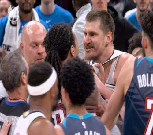 怒火中燒的約基奇自然咽不下這口氣,塞爾維亞人馬上起身沖向多爾特進(jìn)行對峙,他雙目圓睜,表情兇狠。杰林·威廉姆斯和霍姆格倫見形勢不妙,快步上前擋在了二人之間,阻止了沖突的規(guī)模進(jìn)一步擴(kuò)大。雖然說10多名球員、裁判、教練和工作人員瞬間圍成一團(tuán),但大部分人依然保持理性,堅定勸架的立場,事態(tài)因此沒有進(jìn)一步升級。