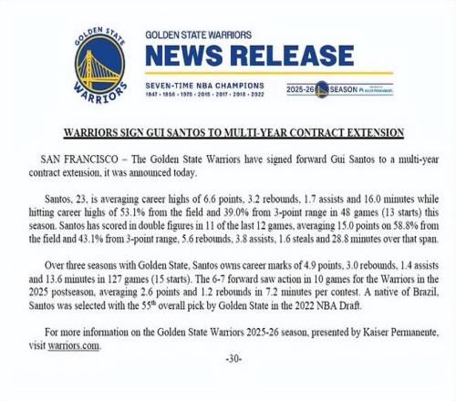 3年1500萬(wàn)美元!勇士官宣提前續(xù)約桑托斯:第3年是球員選項(xiàng)