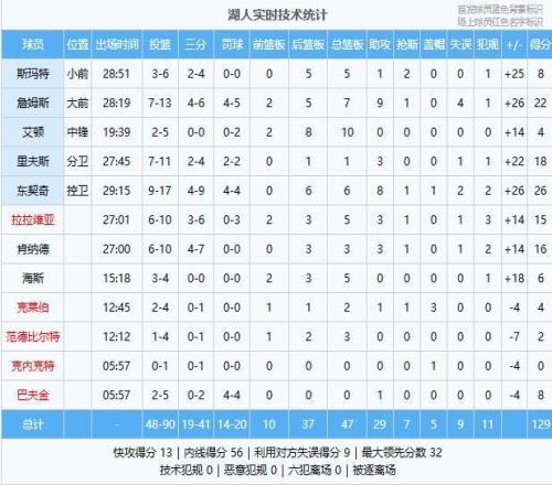 湖人隊(duì):東契奇26分6板8助、詹姆斯22分7板9助、里夫斯18分1板3助、肯納德16分3板3助、拉拉維亞15分5板3助、斯瑪特8分5板1助2斷、巴夫金8分1助、海斯6分5板、艾頓4分10板