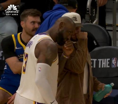 下半場開局詹姆斯與場邊的庫里交流。