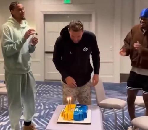 湖人賽前給東契奇慶祝27歲生日,追夢擁抱東契奇賀壽。