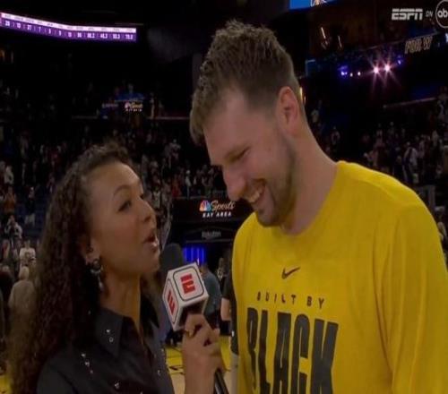 此役正值東契奇27歲生日夜,賽后東契奇在場(chǎng)邊接受了ESPN的采訪,女記者問(wèn)到東契奇,“盧卡,謝謝你!還沒祝你生日快樂(lè)呢,別想著就這么開溜,感覺如何?我們聽到了你的隊(duì)友們?cè)跒槟愠崭?,他們送你什么禮物了嗎?”