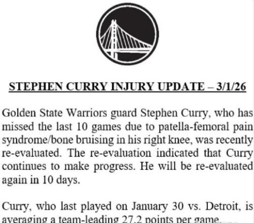 北京時(shí)間3月2日,當(dāng)庫里生涯第2次因傷缺席整個(gè)2月份的比賽,如今根據(jù)勇士官方傷病報(bào)告顯示,庫里將在10天后去復(fù)診他的跑步膝,也將至少再缺席5場(chǎng)比賽,對(duì)于勇士整體戰(zhàn)斗力是極大的削弱。