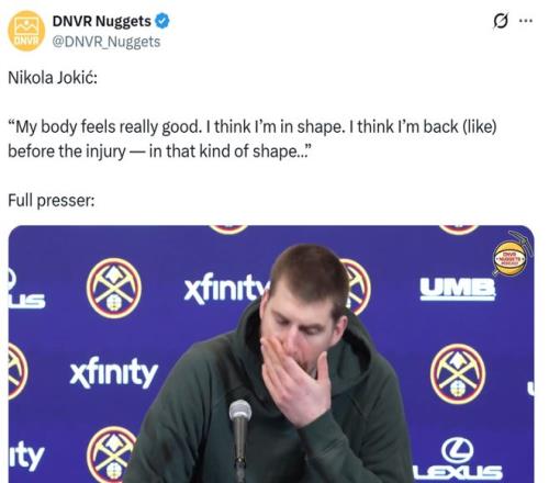 好在約基奇狀態(tài)明顯正在回暖,賽后約基奇表示自己的身體感覺非常好,正在恢復(fù)到受傷前的那種狀態(tài)。