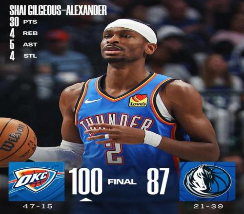 常規(guī)賽,雷霆客場100-87戰(zhàn)勝獨(dú)行俠。