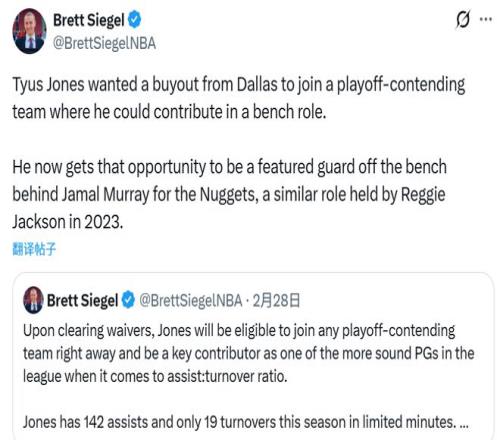 名記Siegel跟進報道稱,瓊斯與獨行俠達成買斷,是想加盟一支具備季后賽競爭力的球隊,并在球隊中擔任替補貢獻者。如今他得到了這樣的機會 —— 將在掘金擔任賈馬爾-穆雷身后的主要替補后衛(wèi),這與2023年雷吉-杰克遜在掘金的角色相似。