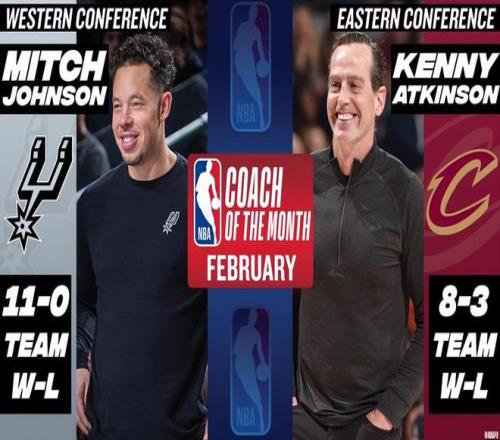 米奇-約翰遜率領(lǐng)馬刺打出11勝0負(fù)的2月不敗戰(zhàn)績,當(dāng)選西部月最佳教練。阿特金森帶領(lǐng)騎士打出8勝3負(fù)的2月戰(zhàn)績,當(dāng)選東部月最佳教練。