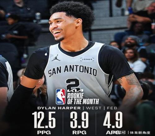 至于最佳新秀,哈珀單月場均貢獻(xiàn)12.5分、3.9個(gè)籃板以及4.9次助攻。乍一看,這數(shù)據(jù)似乎平平無奇,與東部同獲此殊榮的克努佩爾相比,更是略顯遜色??藞鼍苻Z下21.5命中4.5記三分,三分命中率高達(dá)48.5%。然而,無奈西部新秀中表現(xiàn)突出者寥寥,且馬刺隊(duì)的戰(zhàn)績太過耀眼,這才讓哈珀脫穎而出。
