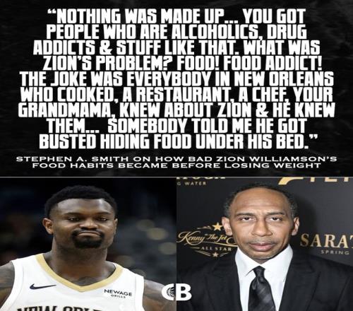 A-史密斯的原話是:“我沒有編造任何東西…… 你知道有酗酒的、吸毒成癮的那些人。那錫安的問題是什么?食物!他是食物成癮!笑話就是,新奧爾良每個(gè)會(huì)做飯的人 —— 餐館、廚師、你奶奶,全都認(rèn)識(shí)錫安,他也認(rèn)識(shí)他們……有人跟我說,他被抓到把食物藏在床底下?!?/p>
