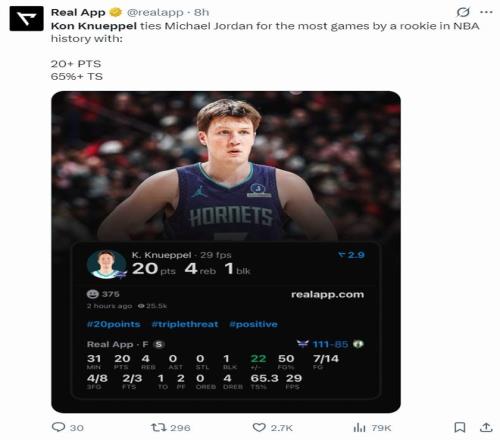 克努佩爾再度創(chuàng)造多項紀(jì)錄:1.他比肩新秀賽季的邁克爾-喬丹,拿到一樣多的20分+真實命中率65%的場次;