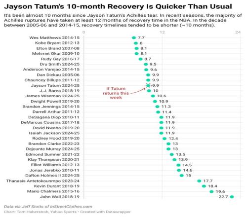 放在現(xiàn)代NBA,這依然是極快的回歸速度。不到10個(gè)月復(fù)出,將是2015–16賽季魯?shù)?蓋伊(不到9個(gè)月)之后,首發(fā)球員里最快的跟腱回歸。