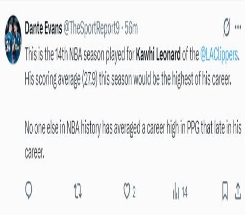 美記DanteEvans寫道:倫納德在職業(yè)生涯第14個賽季拿到場均27.9分創(chuàng)造生涯新高,這是NBA歷史上首位在生涯第14個賽季拿到場均最高分的紀錄,前無古人。