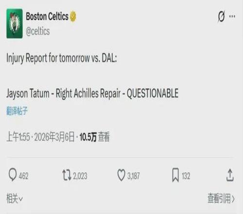 根據(jù)凱爾特人官方消息,塔圖姆對陣獨行俠的狀態(tài)已從缺陣升級為出戰(zhàn)成疑。
