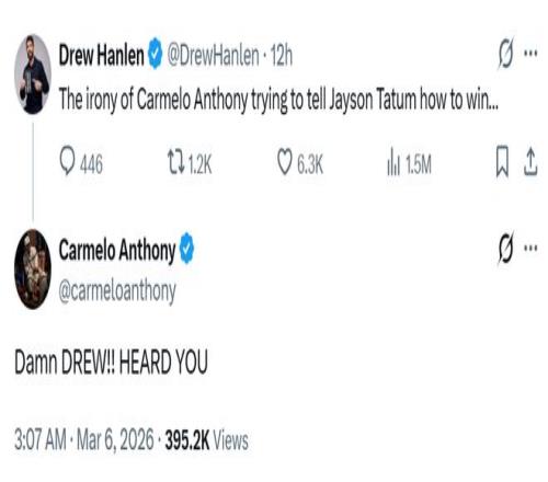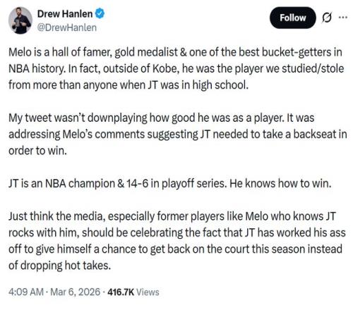 Hanlen隨即正面回應(yīng),先是夸了一通安東尼的名人堂身份,然后話鋒一轉(zhuǎn):“我的推文并不是貶低他,而是回應(yīng)他關(guān)于塔圖姆需要退居二線才能贏球的言論。塔圖姆是NBA總冠軍,季后賽系列賽戰(zhàn)績(jī)14勝6負(fù),他知道如何贏球。”