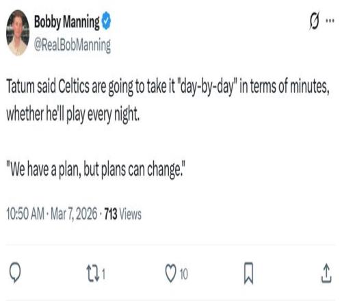除此之外,塔圖姆還公開(kāi)談及自己回歸后的長(zhǎng)期計(jì)劃,他坦言球隊(duì)有明確的計(jì)劃,但計(jì)劃也會(huì)隨時(shí)改變,會(huì)按照一天一天不同的狀態(tài)來(lái)決定出場(chǎng)時(shí)間,以及是否每晚都出戰(zhàn)。