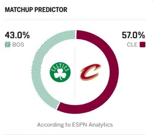 ESPN預(yù)測(cè)本場(chǎng)比賽勝率:騎士57%,凱爾特人43%。