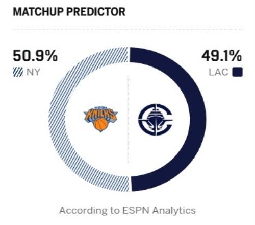 ESPN今日給出了本場勝率預(yù)測,快船為49.1%,尼克斯50.9%。