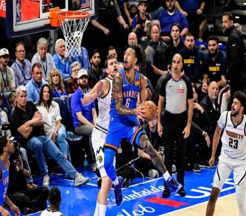上一次比賽的這個沖突,也讓本場比賽變得更有看點。此役,由于霍姆格倫和哈滕的缺陣,雷霆陣中可用的中鋒只剩杰林·威廉姆斯一人,如何阻擋約老師成為最大難題。不過,比賽一開始,掘金率先站出來的是阿隆·戈登,他火力全開,單節(jié)砍下19分,率領(lǐng)掘金在第一節(jié)反客為主得到40分。雷霆雖然落后,但是也沒有讓分差被拉開,只是以3分劣勢結(jié)束首節(jié)。