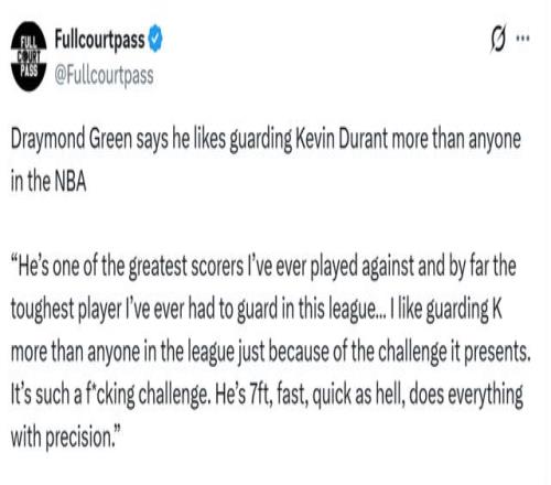 格林和杜蘭特曾是并肩爭冠的隊(duì)友,這些年卻成了針鋒相對的對手。兩人每次交手,都堪稱必看大戲。盡管外界總說他倆不和,但有一點(diǎn)毋庸置疑:彼此之間充滿尊重。格林最近的一番話,更是將這份敬意體現(xiàn)得淋漓盡致。