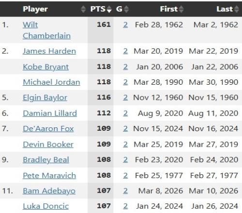 阿德巴約連續(xù)兩場(chǎng)比賽合砍107分和東契奇并列第11第一是161分