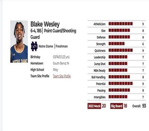 進(jìn)入大一賽季,他立刻被麥克-布雷教練安排成為球隊(duì)首發(fā),他的加入讓圣母大學(xué)耳目一新,球隊(duì)最終取得22勝10負(fù)戰(zhàn)績(jī),時(shí)隔五年重新殺回瘋狂三月,而且在瘋?cè)惓讨幸苍诘诙啽鋼魯×税⒗婉R大學(xué),最終進(jìn)入32強(qiáng),韋斯利個(gè)人場(chǎng)均出場(chǎng)29分鐘拿下14分3.7籃板2.4助攻1.3搶斷的全能數(shù)據(jù),選秀聲望迅速提升,賽季結(jié)束宣布參加選秀.