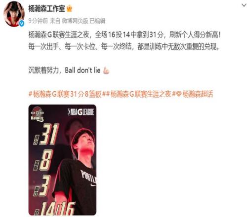 賽后,楊瀚森工作室發(fā)聲:楊瀚森G聯(lián)賽生涯之夜,全場16投14中拿到31分,刷新個人得分新高!
