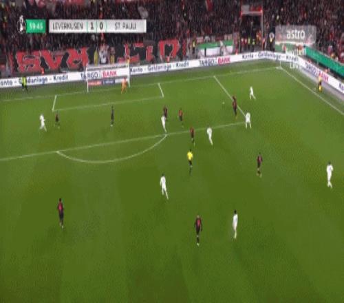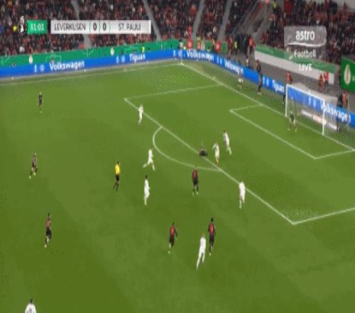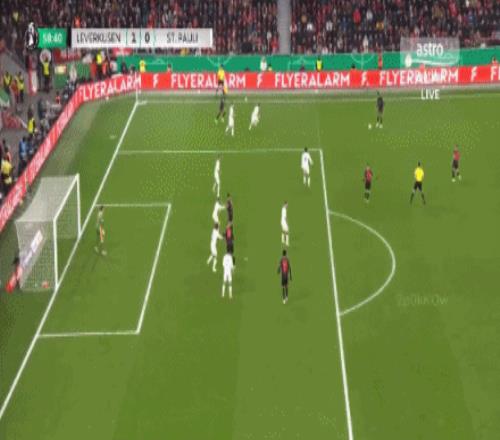 第31分鐘,泰里耶凌空抽射,皮球直掛死角,勒沃庫森1-0圣保利