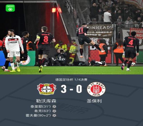北京時間2月4日德國足協(xié)杯 1/4決賽,勒沃庫森對陣圣保利。上半場勒沃庫森泰里耶破門首開記錄,下半場??似崎T擴大比分,隨后格里馬爾多助攻霍夫曼破門再下一城。最終比分勒沃庫森 3-0 圣保利。