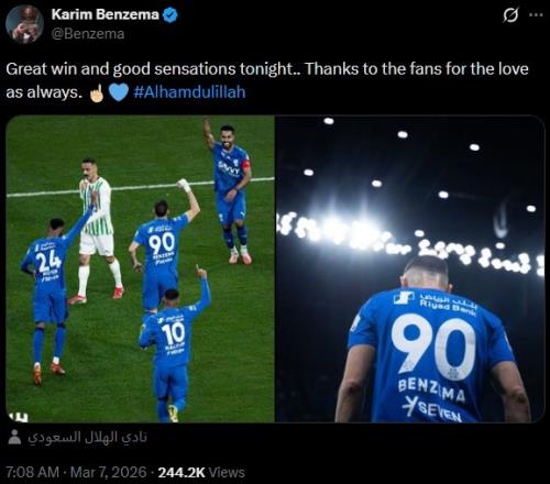 體育播報3月7日宣 今天凌晨,利雅得新月4-0大勝納杰馬體育,本澤馬賽后在社交媒體發(fā)文,慶祝勝利。