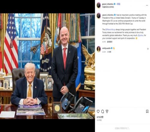 “世界杯總能將人們凝聚在一起,特朗普總統(tǒng)和我們一樣,對這場必將精彩紛呈的全球盛會充滿期待。非常感謝您,@特朗普,感謝您一直以來的支持和合作精神。