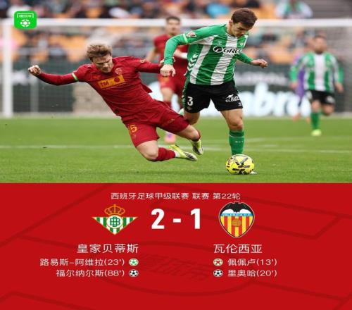 北京時(shí)間2月1日西班牙足球甲級(jí)聯(lián)賽 聯(lián)賽 第22輪,皇家貝蒂斯主場(chǎng)對(duì)陣瓦倫西亞?;始邑惖偎孤芬姿?阿維拉破門(mén),福爾納爾斯破門(mén)。瓦倫西亞里奧哈破門(mén)。最終比分皇家貝蒂斯 2-1 瓦倫西亞。