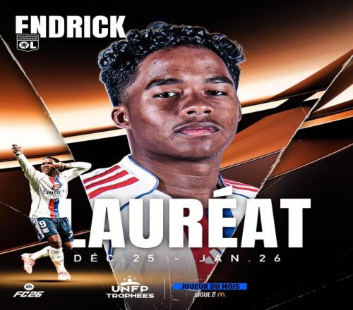 北京時(shí)間2月15日,官方消息,里昂前鋒恩德里克當(dāng)選法甲1月最佳球員。