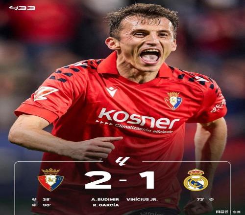 西甲第25輪,皇馬客場1-2奧薩蘇納,聯(lián)賽8連勝終結(jié),先賽一場2分領跑。布迪米爾造點+點射,姆巴佩小角度破門但越位在先無效,巴爾韋德助攻維尼修斯扳平,勞爾-加西亞絕殺。