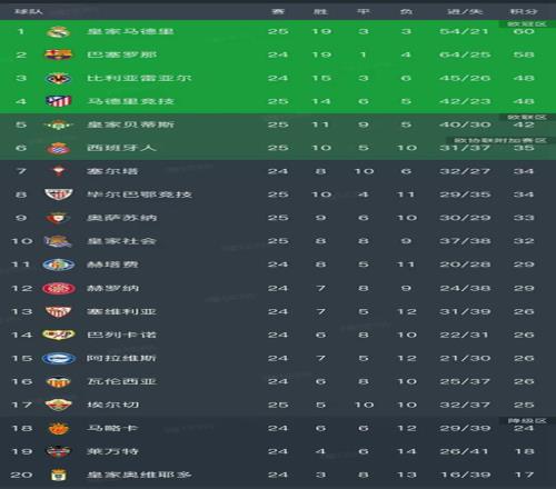 北京時間2月22日,西甲第25輪率先結(jié)束了5場比賽,我們看看最新積分榜變動,主要的信息是:皇馬1-2爆冷不敵奧薩蘇納、馬競4-2大勝西班牙人、畢爾巴鄂競技2-1埃爾切、皇家社會3-3皇家奧維耶多,皇家貝蒂斯1-1巴列卡諾。