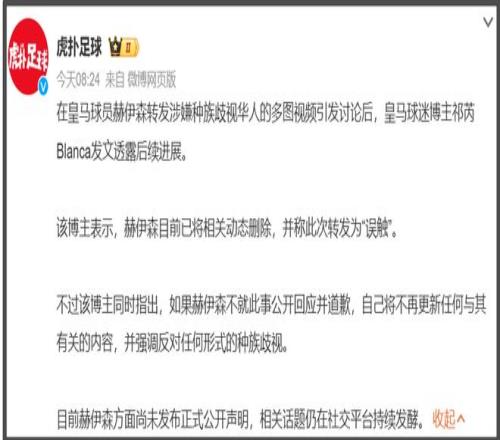 輿論升級過程中,有一位網紅博主嘗試聯系皇馬俱樂部和赫伊森本人,都沒有得到正式回應,繞了一圈聯系了赫伊森的隊友,也就是皇馬俱樂部其他球員,才被告知是赫伊森不小心碰到了才轉發(fā)的,包括刪除動態(tài),都是赫伊森隊友和赫伊森媽媽提醒的——他媽媽來了!他媽媽真的來了!