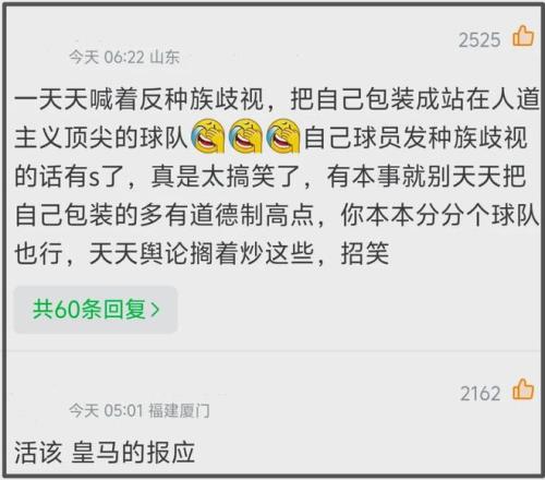 要知道就在不久前的歐冠附加賽上,現場出現了歧視黑人球員的事件,皇馬俱樂部立馬發(fā)布反歧視聲明——敢情別人歧視他們球員不行,他們球員歧視中國人就可以?