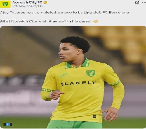 官方:諾維奇宣布年輕的邊鋒阿賈伊-塔瓦雷斯轉(zhuǎn)會加盟了巴薩。